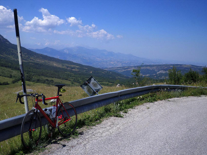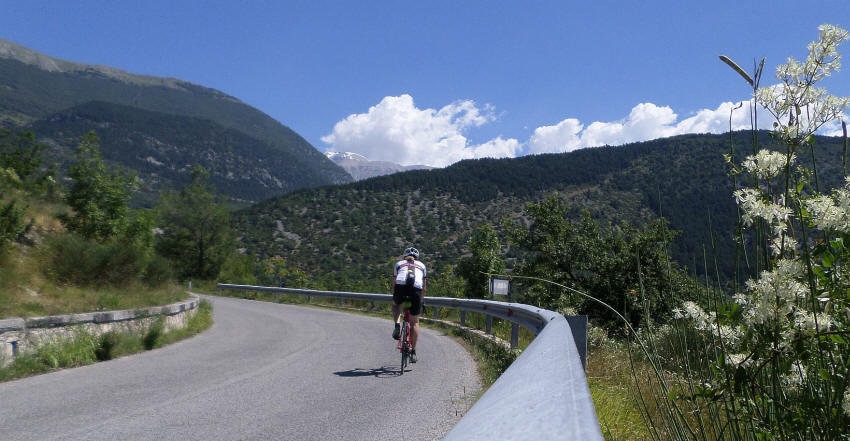 Majella Ronda 174km 3500 HM Wenn ein solcher, doch recht isolierter Berg schon in der Nachbarschaft liegt, dann muss man(n) ihn umrunden. Mindestens 160 aber keine 200 Km sollten es sein. Auf bekannten, steilen Wegen ging es morgens Richtung Süden, damit die Sonne nicht den ganzen Tag im Gesicht brennt. Die Richtung war Palena, das vorbei an bekannten Orten, über die SS84 mit moderater Steigung und mit zunehmender Höhe auch immer wunderbareren Blicken nach ca. 30 km und gut 800 HM erreicht wurde.