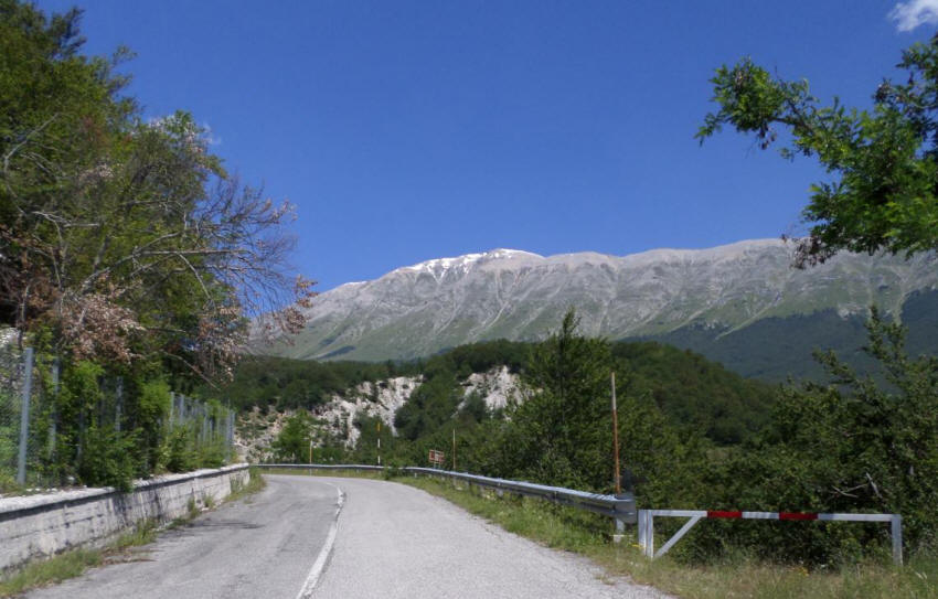In Campo Giove (Bild oben) kann man direkt zum Passo San Leonardo (1300 m NN) abbiegen oder über Casano wunderbar kurvenreich herab zur Hochebene von Sulmona (500 m NN) fahren, um dann wieder jede Menge Höhenmeter bis zum Pass fressen zu können; klar, welchen Weg ich gewählt habe. Auf dem Weg nach Pacentro (800 m NN) Blicke auf die mit Neuschnee bedekten Gipfel des 2700 Meter hohen Monte Amaro!